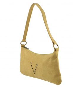 Γυναικεία τσάντα χειρός στυλ φάκελος, καστόρι/σουέτ με διακριτικά μεταλλικά στοιχεία χρυσού χρώματος σε σχήμα “V” στο μπροστινό μέρος, διαθέσιμη σε δύο χρώματα: ταμπά και μαύρο.