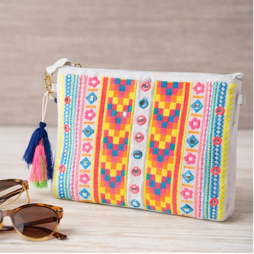 Κομψό τσαντάκι χειρός με ιδιαίτερο boho χαρακτήρα, ιδανικό για καθημερινές αλλά και πιο ξεχωριστές εμφανίσεις. Κατασκευασμένο από ανθεκτικό ύφασμα σε φυσική απόχρωση, διακοσμημένο με πολύχρωμο κεντημένο γεωμετρικό σχέδιο και λεπτομέρειες που προσθέτουν μοναδικό στυλ.