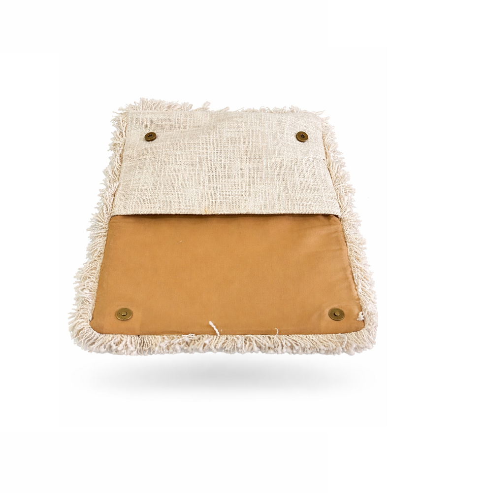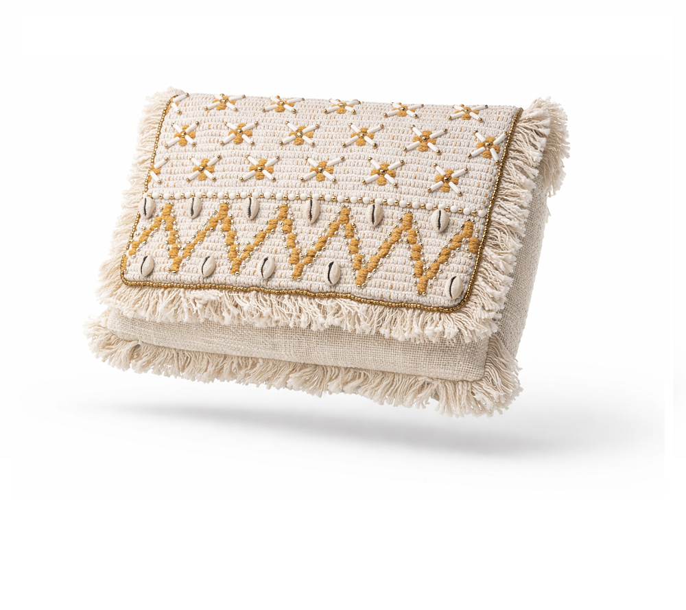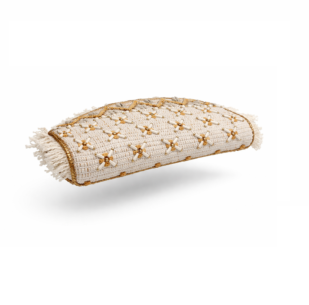 Γυναικεία τσάντα χειρός φάκελος χειροποίητη πλεκτή, σε αποχρώσεις εκρού με χρυσό κίτρινες λεπτομέρειες, με επένδυση από ύφασμα και διακοσμητικές πέρλες. Έχει στις δεξιά και αριστερά πλευρές τελείωμα με κοντό κρόσσι. Λουρί μεταφοράς και κλείνει με φερμουάρ. https://bagshats.gr
