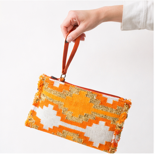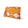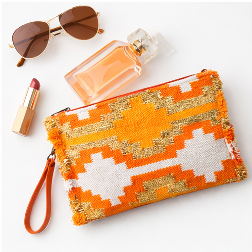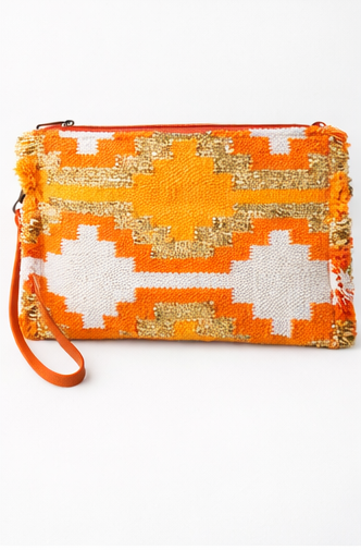 Γυναικεία τσάντα χειρός φάκελος χειροποίητη πλεκτή, σε αποχρώσεις Πορτοκαλί και Χρυσού, με επένδυση από ύφασμα. Έχει στις δεξιά και αριστερά πλευρές τελείωμα με κοντό κρόσσι. λουρί μεταφοράς και κλείνει με φερμουάρ. https://bagshats.gr