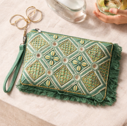 Γυναικεία τσάντα χειρός φάκελος χειροποίητη υφαντή 5018, σχέδιο μάτι σε αποχρώσεις πράσινου και καφέ, με επένδυση από ύφασμα και διακοσμητικές πέρλες. Έχει στις δεξιά και αριστερά πλευρές τελείωμα με κοντό κρόσσι. λουρί μεταφοράς και κλείνει με φερμουάρ. https://bagshats.gr