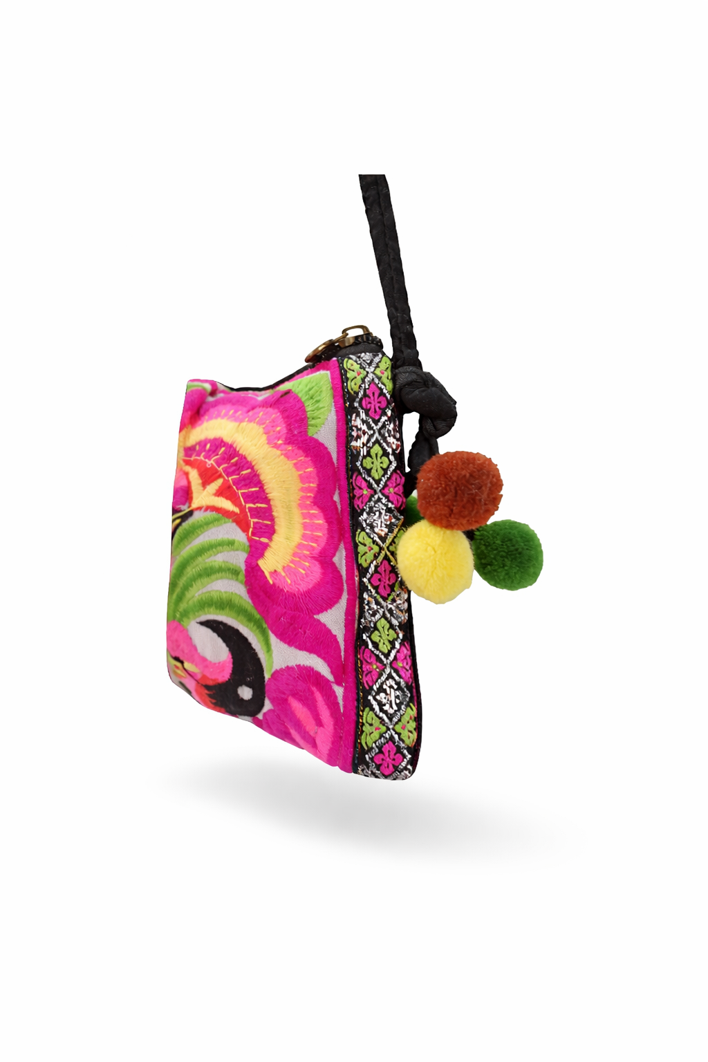 Χαρίστε ζωντάνια και ένταση στο look σας με αυτή τη μοναδική χειροποίητη έθνικ τσάντα ώμου. Το έντονο φλοράλ κέντημα σε φούξια, πράσινο, κίτρινο και μαύρο κάνει το τσαντάκι να ξεχωρίζει, ενώ οι πολύχρωμες πομ-πον λεπτομέρειες τονίζουν τον boho χαρακτήρα του.