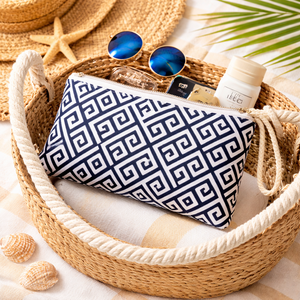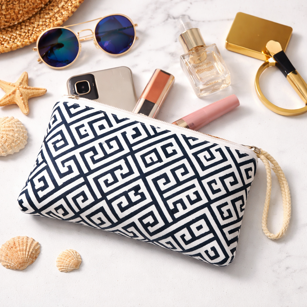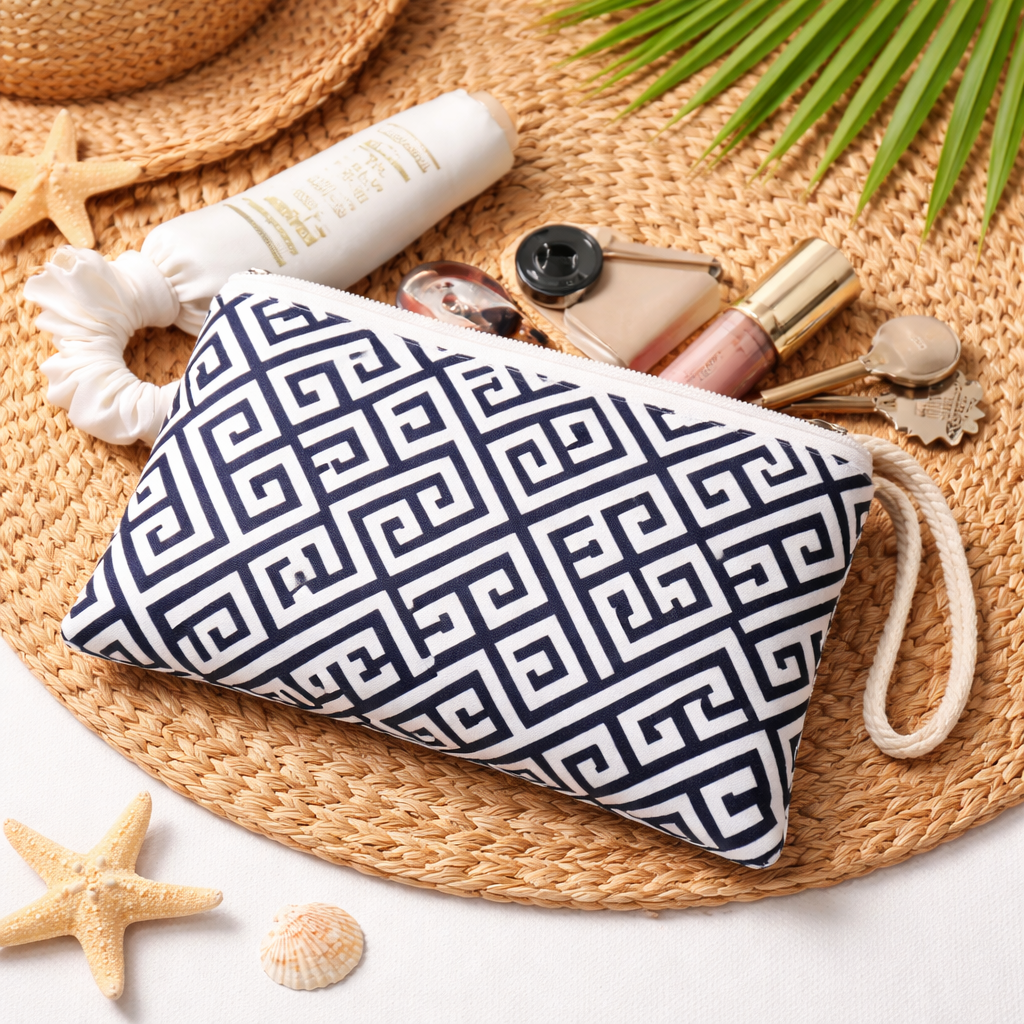 Κομψό και πρακτικό νεσεσέρ με μοτίβο μαίανδρο, εμπνευσμένο από τη αρχαία Ελλάδα. Ιδανικό για καθημερινή χρήση, για καλλυντικά, μικροαντικείμενα ή ως stylish clutch.Διαθέτει ανθεκτικό φερμουάρ και πρακτικό λουράκι καρπού για εύκολη μεταφορά. Το ιδιαίτερο σχέδιο προσθέτει μία μοντέρνα αλλά και συμβολική πινελιά που ξεχωρίζε. https://bagshats.gr/