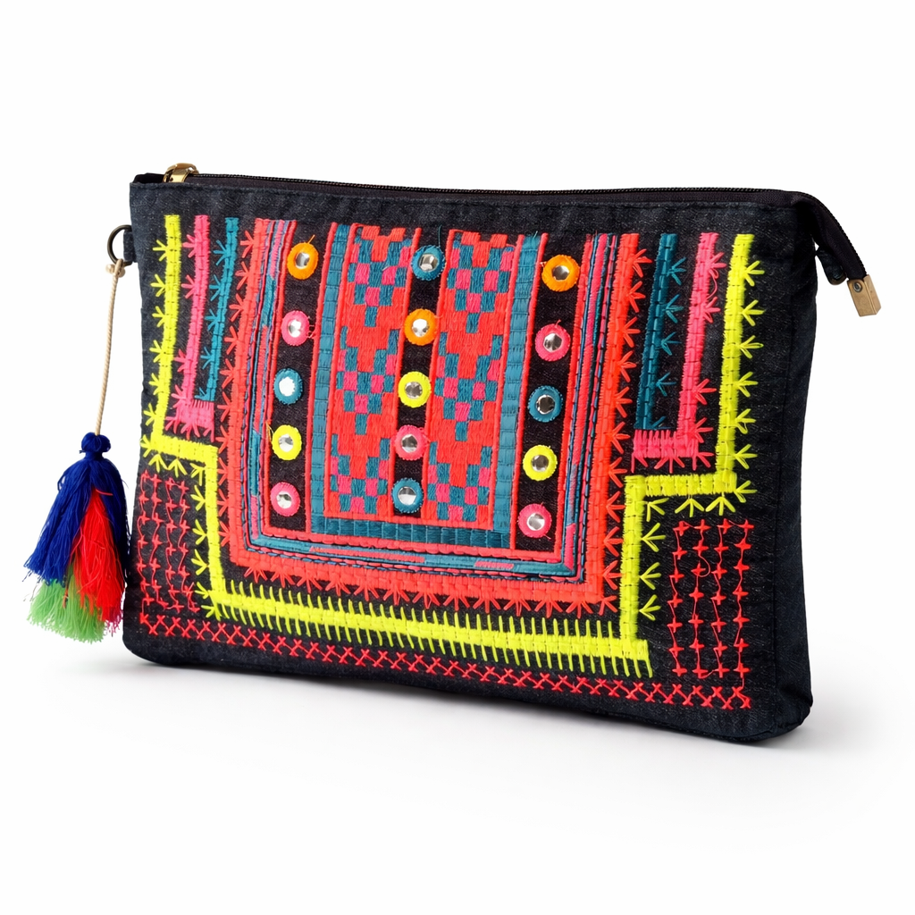 Κομψό τσαντάκι χειρός με ιδιαίτερο boho χαρακτήρα, ιδανικό για καθημερινές αλλά και πιο ξεχωριστές εμφανίσεις. Κατασκευασμένο από ανθεκτικό ύφασμα σε φυσική απόχρωση, διακοσμημένο με πολύχρωμο κεντημένο γεωμετρικό σχέδιο και λεπτομέρειες που προσθέτουν μοναδικό στυλ.